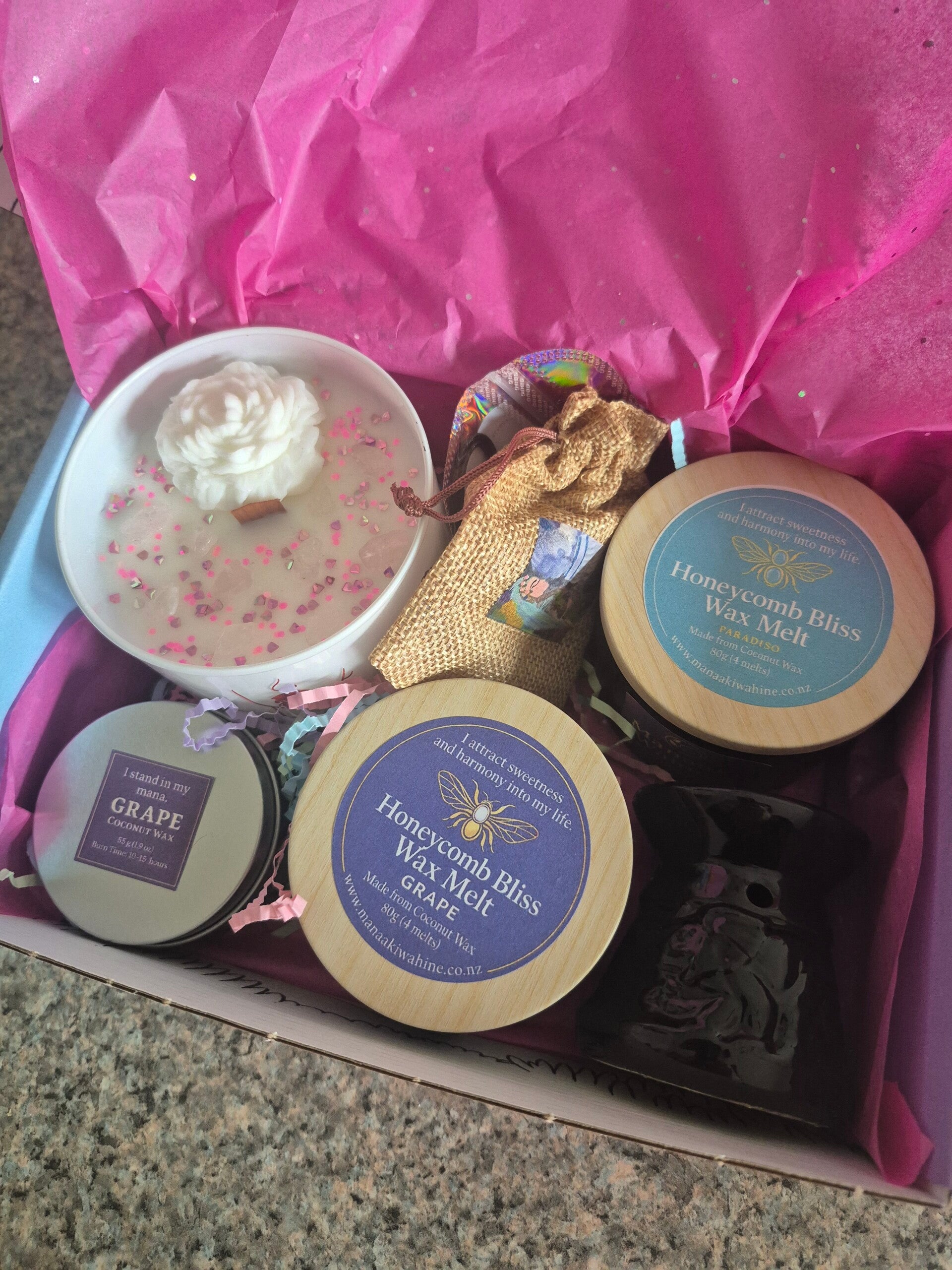 ✔ Healing Candles – Hand-poured coconut wax candles to calm and ground your space. ✔ Mini Poi Memento – A handcrafted taonga symbolizing resilience and harmony. ✔ Affirmation Cards – Six empowering messages to uplift and inspire. ✔ Crystal Energy – Carefully chosen stones for peace, clarity, and strength, amethyst crystal necklace included. ✔ Manaaki Wāhine Art Card – Sharing our kaupapa of healing and empowerment.